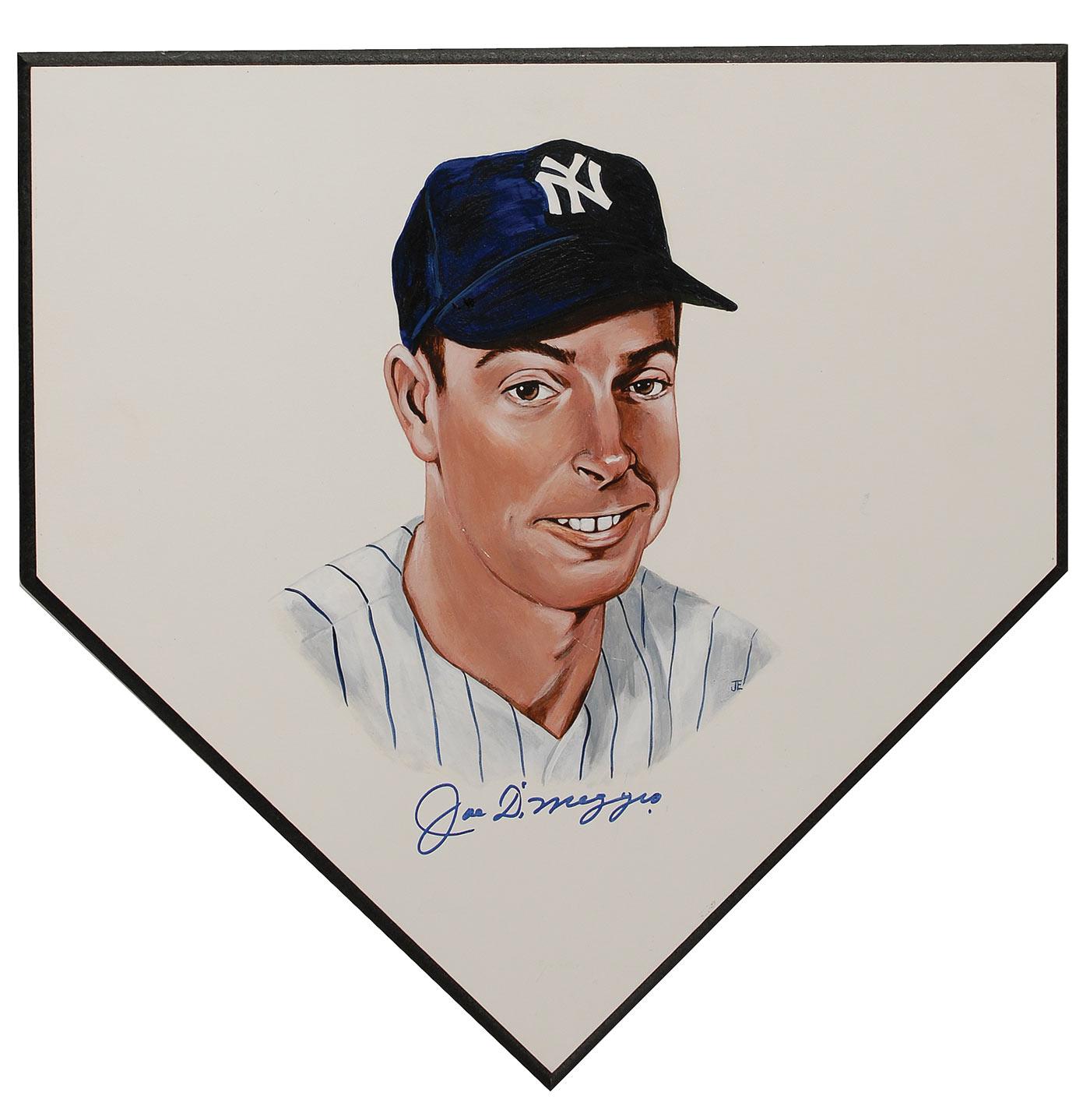 Original oil painting of DiMaggio in his Yankee pinstripes and cap, on a home plate shaped piece of artist’s board, signed under the image in blue felt tip. Painting is affixed to a slightly larger home plate shaped mount to an overall size of 17 x 17. In fine condition.
