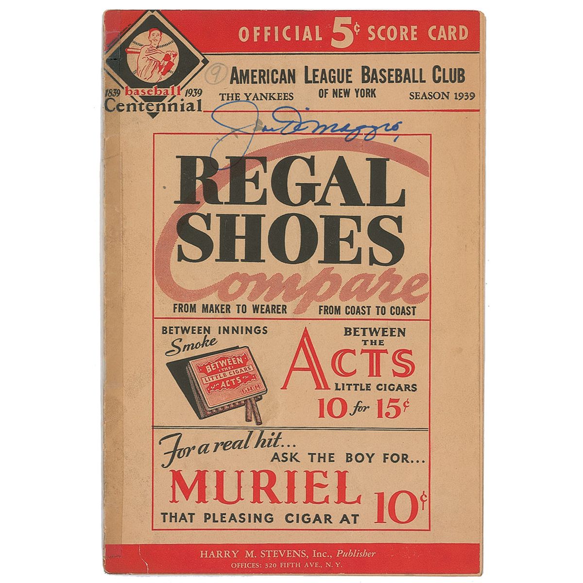 Original 1939 Yankees scorecard from a game between the Yankees and Tigers, 6.5 x 10, signed later on the front cover in blue felt tip. In very good condition, with score card filled out, old tape along hinge, expected handling wear, and scattered toning and soiling.