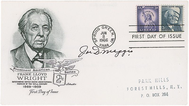 FDC with a cachet honoring Frank Lloyd Wright, signed in black felt tip by DiMaggio. In fine condition, with address stamp in lower right.