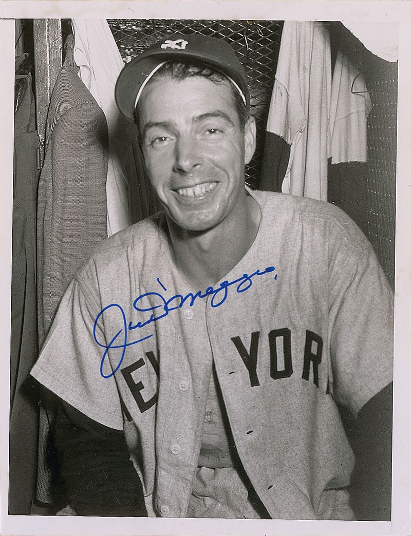 Glossy 7 x 9 photo of DiMaggio posing in the clubhouse in his Yankees road jersey, signed in blue felt tip. Some scattered light creases and surface dings, otherwise fine condition.