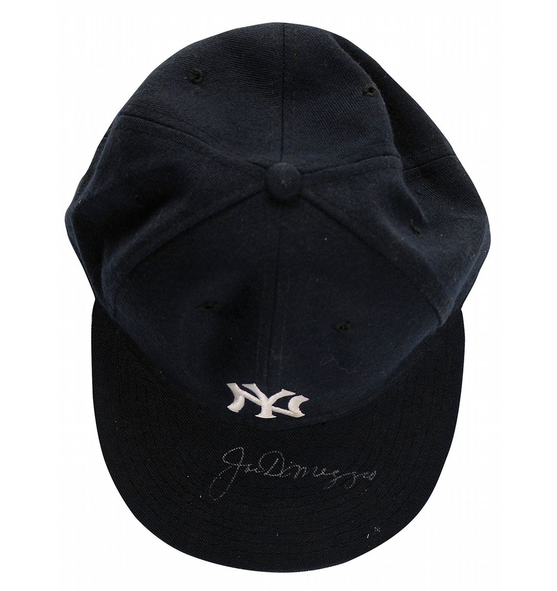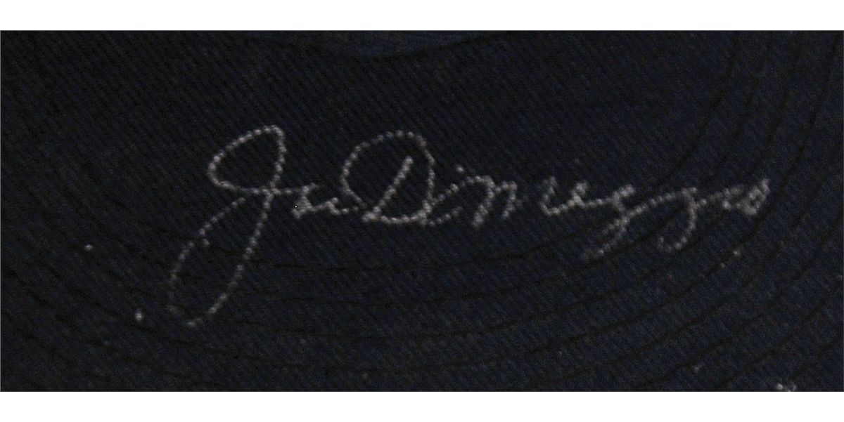 Official New Era Diamond Collection fitted New York Yankees baseball cap signed in silver ink on the brim. In fine condition. DiMaggio signed hats are less commonly found in comparison to signed baseballs.
