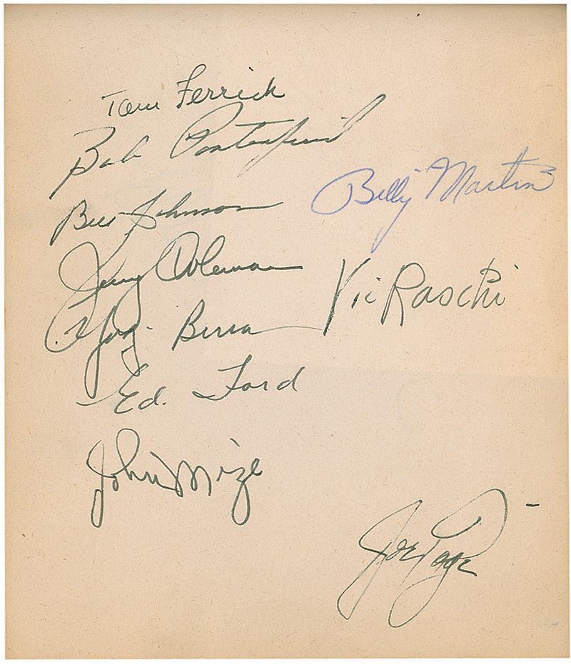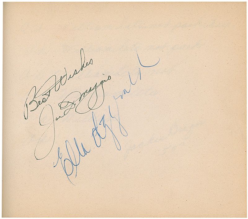 Vintage hardcover autograph album, 7 x 5.5, signed inside in ink and ballpoint by Joe DiMaggio, Ella Fitzgerald, Eddie Cantor, and a single page featuring ten members of the 1950 World Series Champion New York Yankees, including Billy Martin and Hall of Famers Johnny Mize, Yogi Berra and Ed (Whitey) Ford. Also present in the album are numerous signatures of teachers and classmates of the original collector. In very good condition, with a light uniform shade of toning and some separation between the binding and cover.