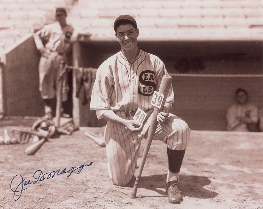 Glossy 14 x 11 photo of DiMaggio as a San Francisco Seal in the midst of his amazing 61-game hit streak, signed in blue felt tip. In fine condition.