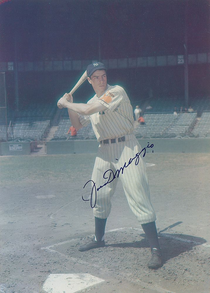 Color 9.75 x 13.75 cardstock photo a young DiMaggio in his batting stance at Yankee Stadium, signed in blue felt tip. In fine condition, with a couple small corner tip dings. Accompanied by a certificate of authenticity from Score Board.
