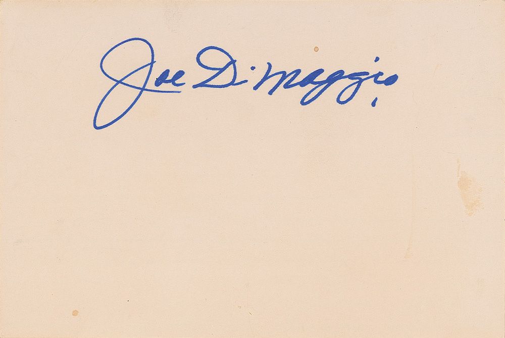 Felt tip signature, “Joe DiMaggio,” on an off-white 6 x 4 card. In fine condition, with light toning and soiling. Accompanied by the original mailing envelope.