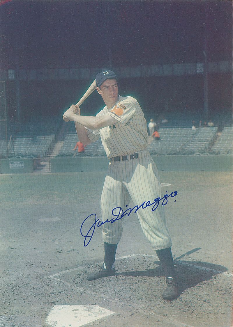 Color 10 x 14 cardstock photo of a young DiMaggio in his batting stance at Yankee Stadium, signed in blue felt tip. In fine condition. Accompanied by a certificate of authenticity from Score Board.