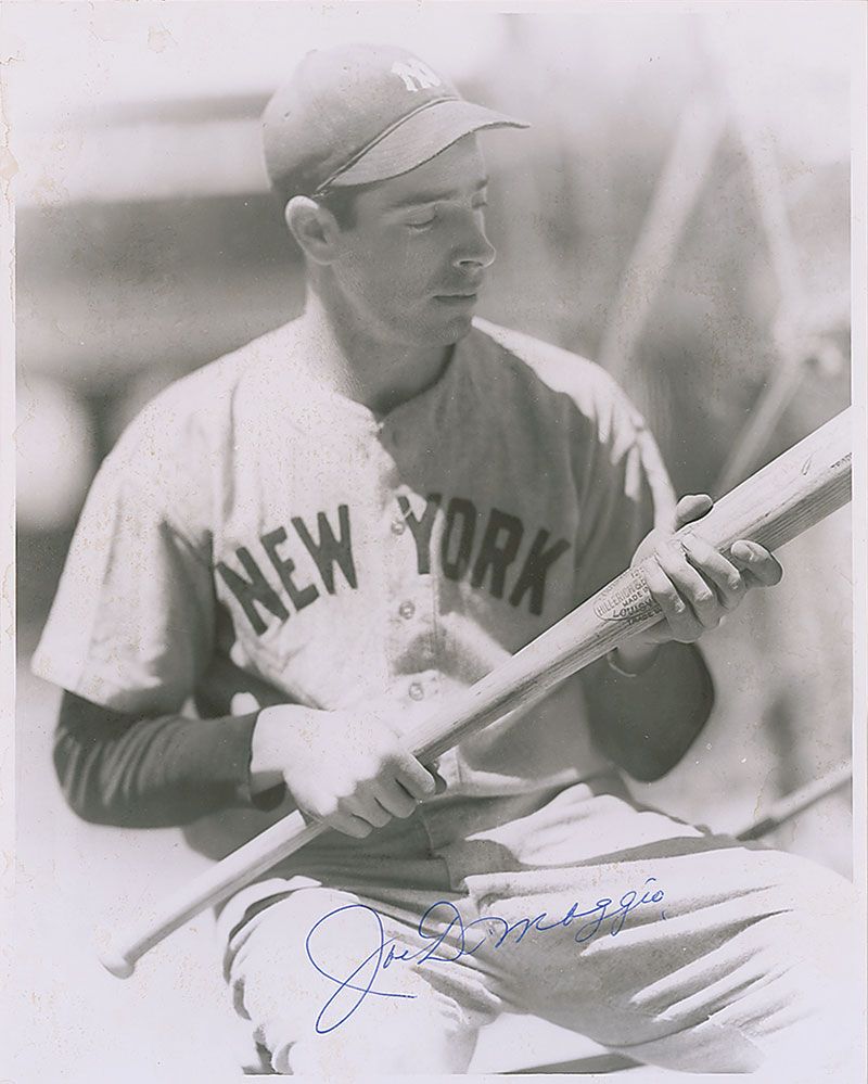 Glossy 8 x 10 photo of DiMaggio admiring one of his bats, signed at the bottom in blue ballpoint. In very good to fine condition, with light scattered dampstaining and foxing.