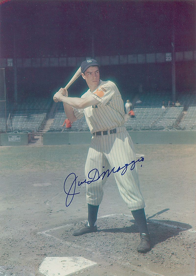 Color 9.75 x 13.75 cardstock photo of a young DiMaggio in his batting stance at Yankee Stadium, signed in blue felt tip. In fine condition, with a couple small corner tip dings. Accompanied by a certificate of authenticity from Score Board.