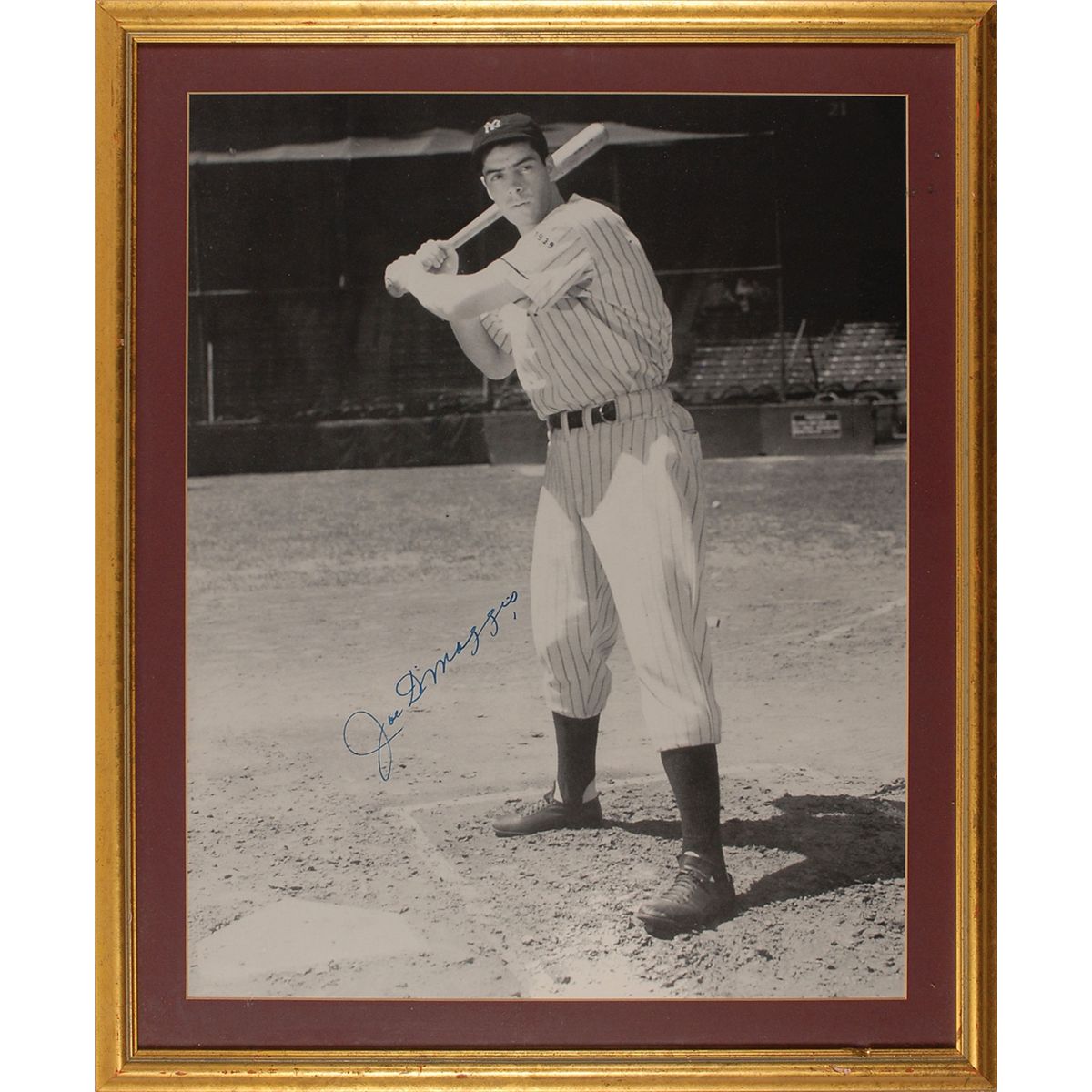 Oversized 15.5 x 19.5 full-length cardstock photo of DiMaggio in the batter’s box in Yankee Stadium, signed in blue felt tip. Matted and framed to an overall size of 19.5 x 23.5. In fine condition.