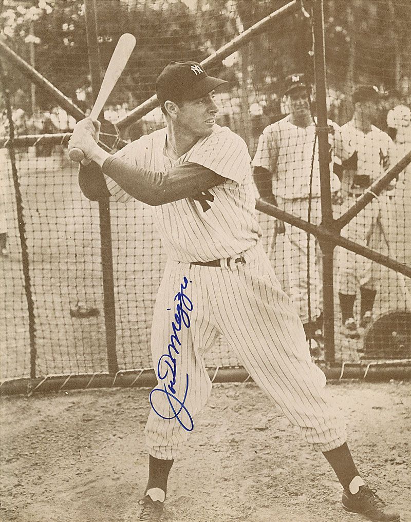 Outstanding 11 x 14 cardstock photo of DiMaggio taking batting practice, signed vertically in blue felt tip. In fine condition.