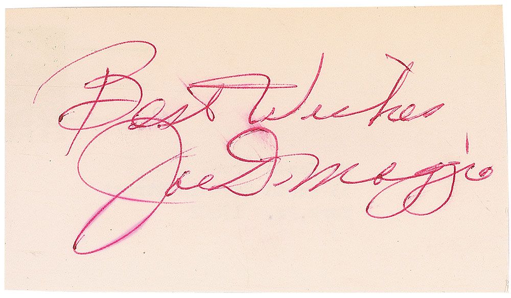Ballpoint signature, “Best Wishes, Joe DiMaggio,” on a 3.75 x 2 card. Some brushing to the signature, otherwise fine condition.