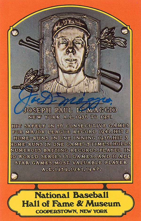 Orange-bordered Hall of Fame plaque card signed in blue felt tip. In fine condition.