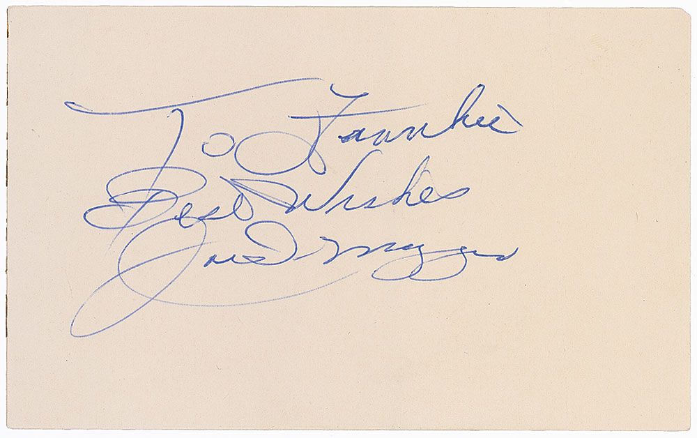Vintage ballpoint signature and inscription, “To Frankie, Best wishes, Joe DiMaggio,” on an off-white 5.5 x 3.5 sheet. In fine condition, with a vertical crease to the right of signature.