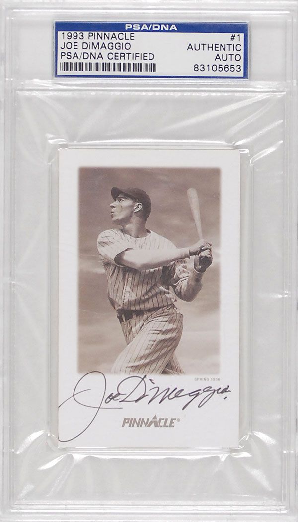 Baseball card from the 1993 Pinnacle set dedicated to DiMaggio, signed at the bottom in black felt tip. Encapsulated in a plastic PSA/DNA authentication holder. In fine condition.