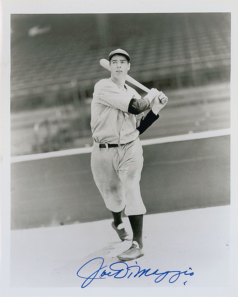 Glossy 8 x 10 photo of a young DiMaggio taking a practice swing, signed in blue felt tip. In fine condition.
