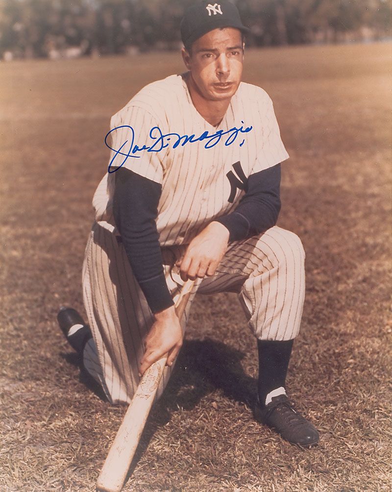 Color satin-finish 8 x 10 photo of DiMaggio kneeling on the field, signed in blue felt tip. In fine condition, with scattered creases (most noticeably to upper right corner).