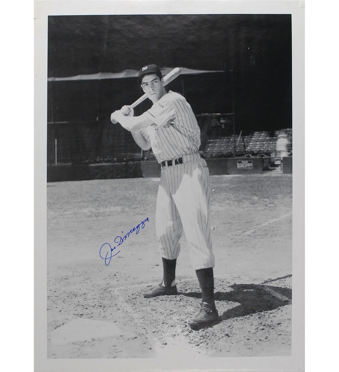 Great poster featuring a full-length image of DiMaggio in his batting stance, 19 x 25, signed in blue felt tip. In fine condition, with a few small edge tears.