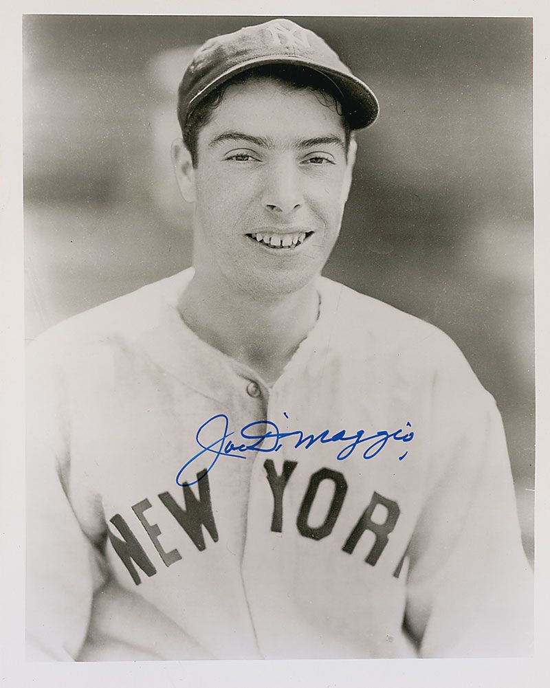 Choice glossy 8 x 10 head-and-shoulders photo of DiMaggio in his Yankees uniform, signed in blue felt tip. In fine condition.