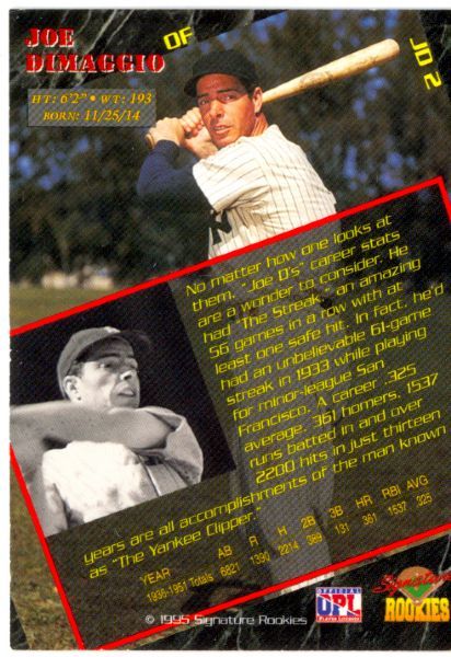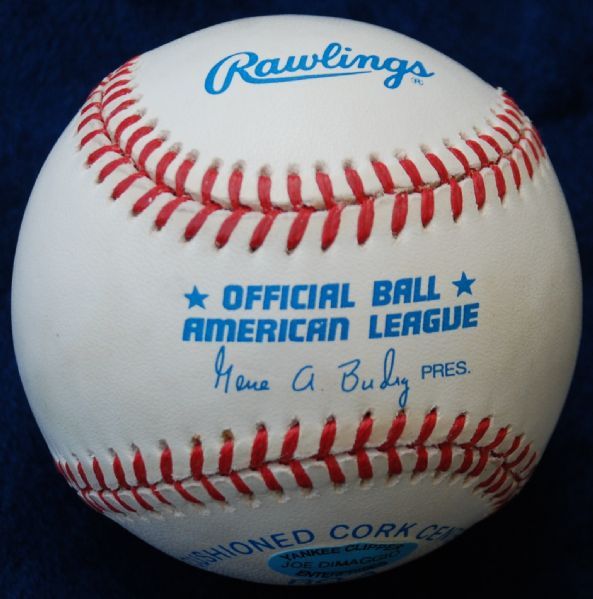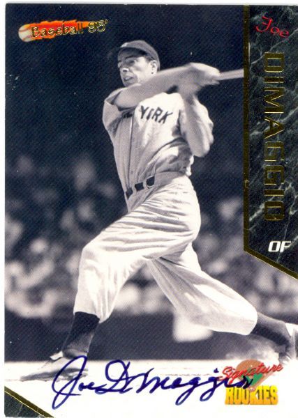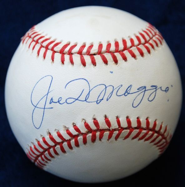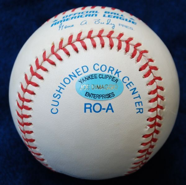 Lot of two items: official Rawlings American League baseball, signed on the sweet spot in blue ballpoint; and a 1995 Signature Rookie trading card signed on the front in felt tip by DiMaggio. In fine condition. COA PSA/ DNA, COA Yankee Clipper Enterprises