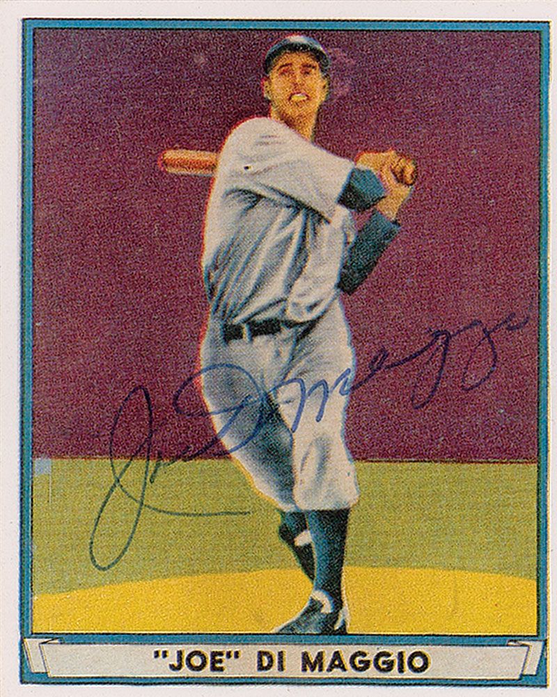 Reprint of DiMaggio’s famous 1941 Play Ball baseball card, 2.5 x 3, signed on the front in blue ballpoint. In fine condition.