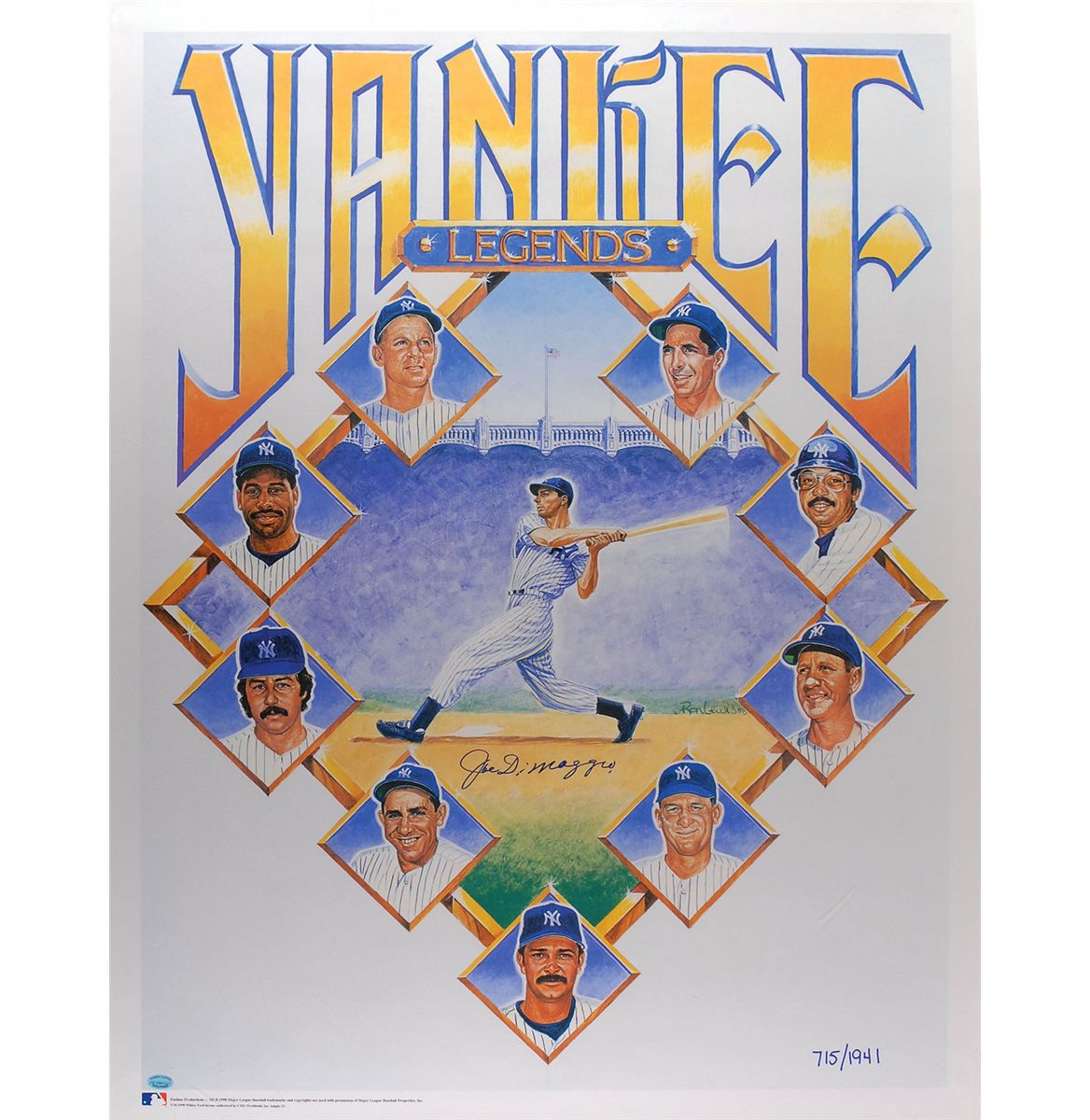 Color limited edition 25 x 32 print entitled ‘Yankees Legends,’ numbered 715/1941, signed in blue felt tip. Rolled and in fine condition. Accompanied by a certificate of authenticity from DiMaggio’s longtime friend and attorney Morris Engelberg from Yankee Clipper Enterprises.
