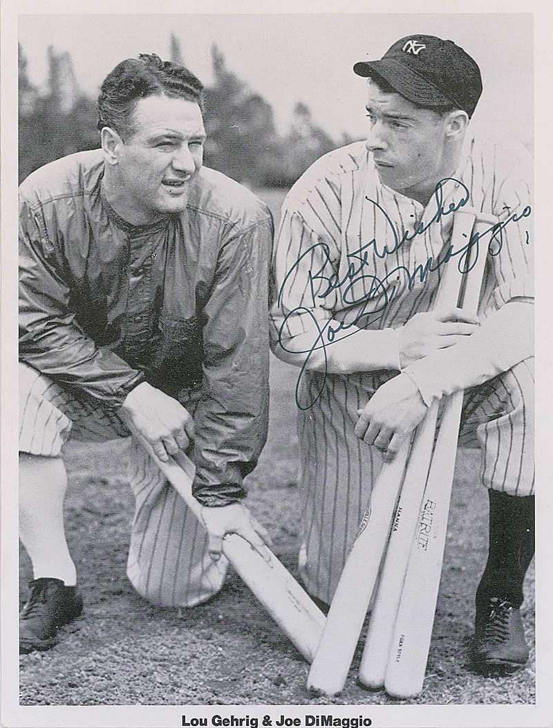 Interesting 6.25 x 8.25 cardstock photo of DiMaggio kneeling on the field with Lou Gehrig, signed in black felt tip, “Best Wishes, Joe DiMaggio.” In fine condition.