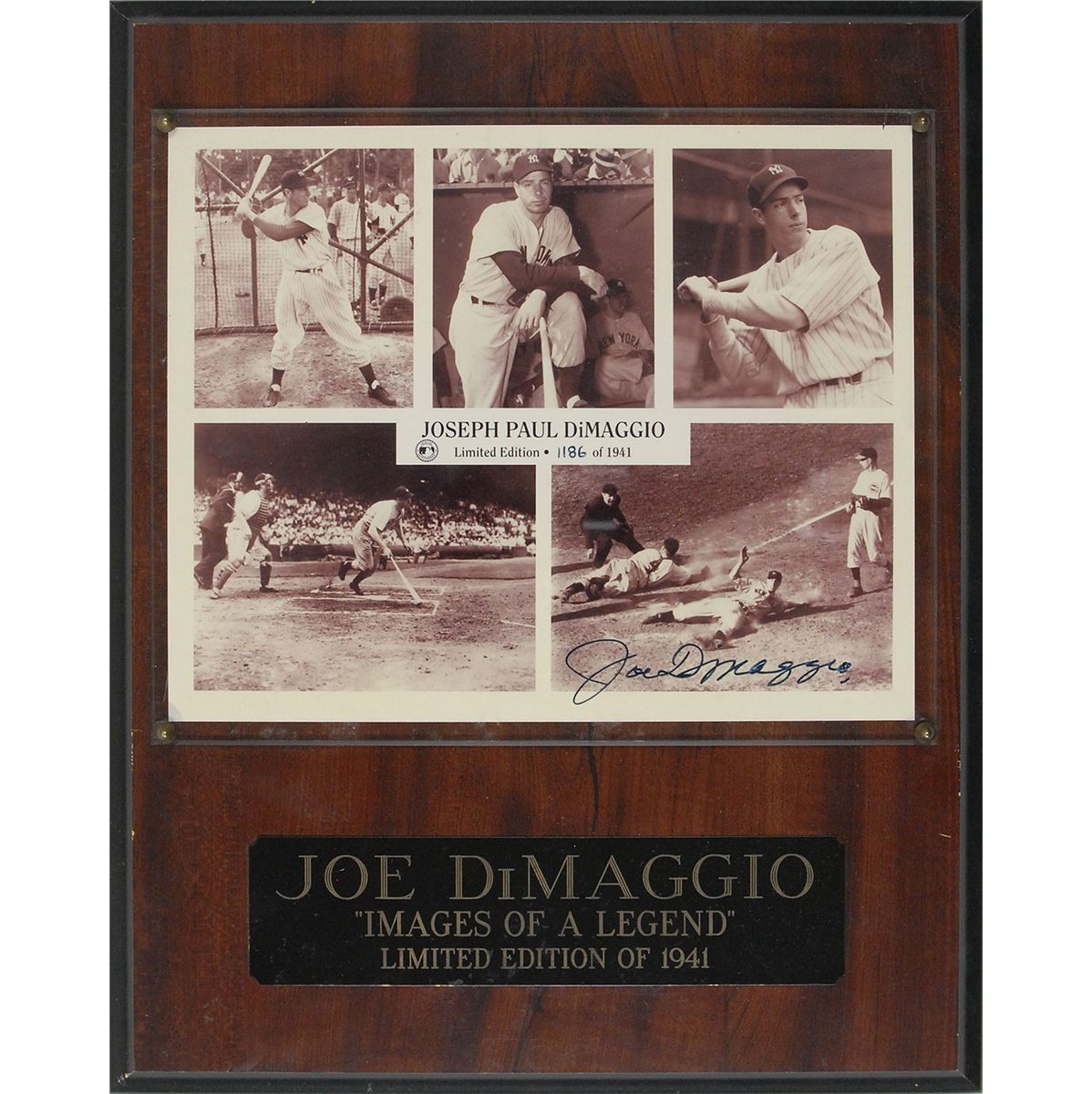 Limited edition glossy 10 x 8 composite photo of DiMaggio in action, numbered 1186/1941, signed in black felt tip. Photo is presented on a wooden plaque behind Lucite to an overall size of 12 x 15. In fine condition.