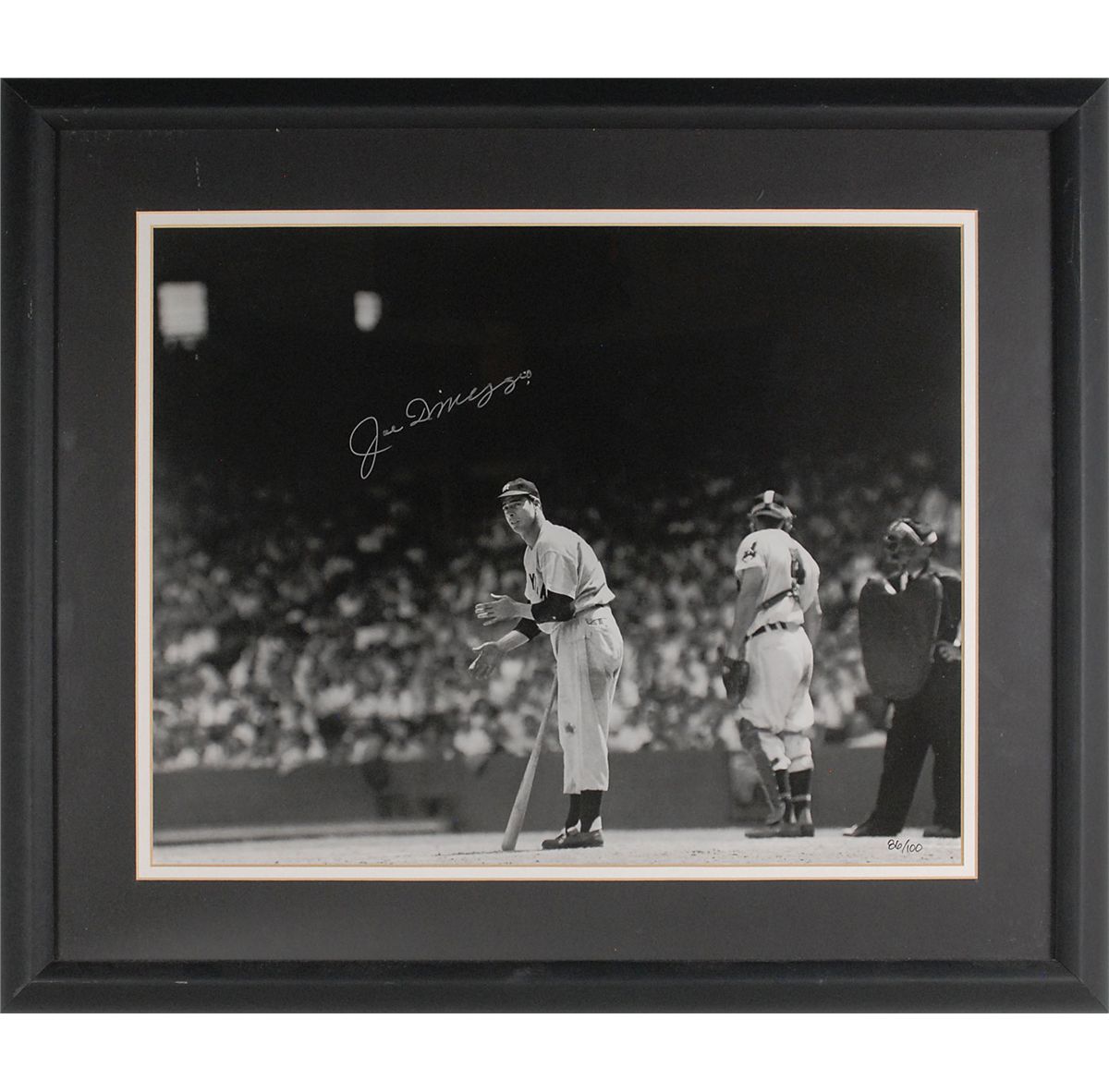 Wonderful limited edition matte-finish 18.75 x 15 photo of DiMaggio in the batter’s box, numbered 86/100, prominently signed in silver ink. Double-matted and framed to an overall size of 26 x 22. In fine condition. Oversized.