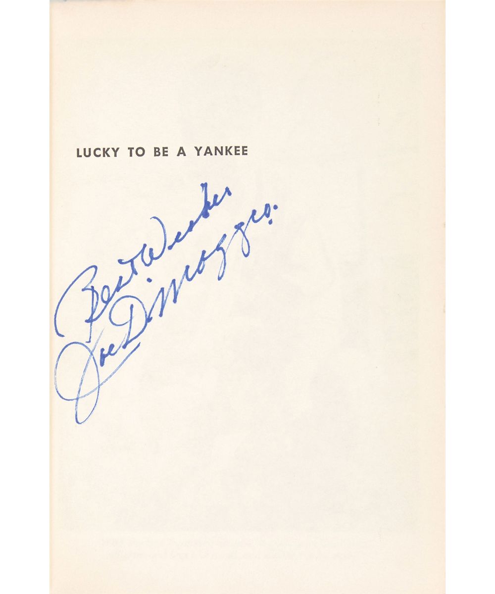 Signed book: Lucky to Be a Yankee. Later printing. NY: Grosset & Dunlap, 1951. Hardcover, 5.5 x 7.75, 221 pages. Signed on the half-title page in blue felt tip, “Best wishes, Joe DiMaggio.” In fine condition.