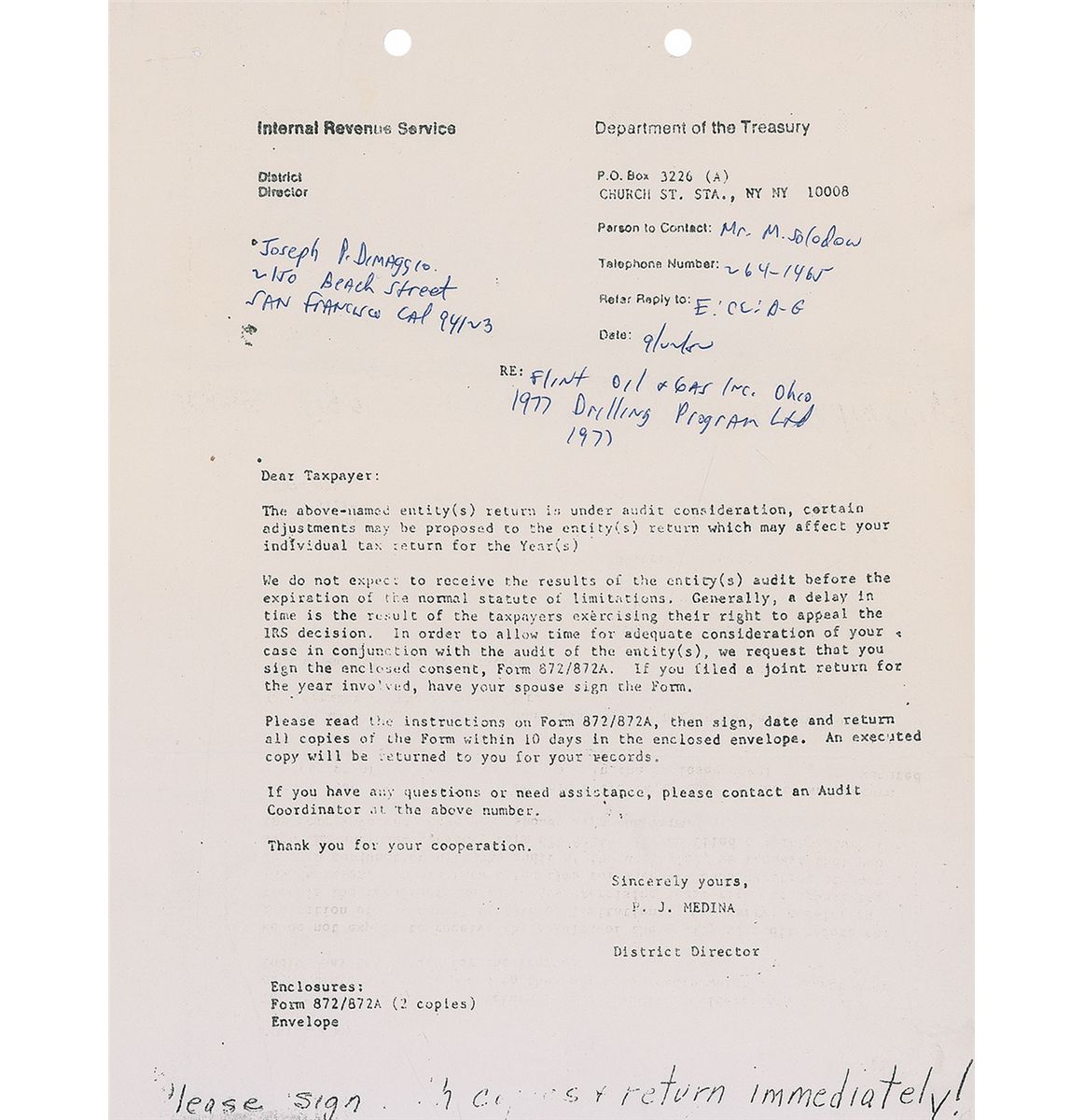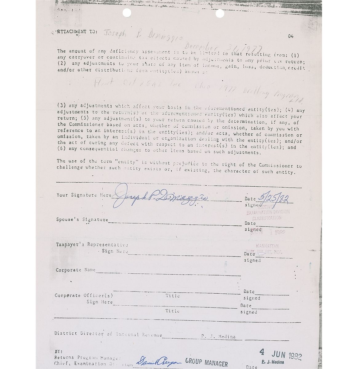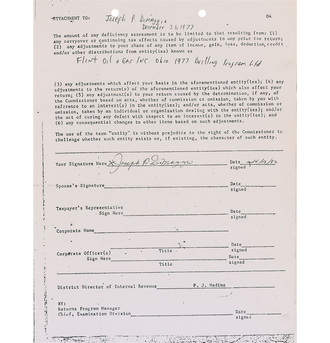 Uncommon DS, signed “Joseph P. DiMaggio,” one page, 8.5 x 11, May 25, 1982. A document regarding taxation adjustments and assessments for the Flint Oil & Gas Inc. Ohio 1977 Drilling Program. Signed at the conclusion in blue ballpoint by DiMaggio. Expected document wear and text difficult to read due to the photocopy process, otherwise fine condition. Accompanied by an IRS cover letter and a photocopy of a similar DiMaggio document.