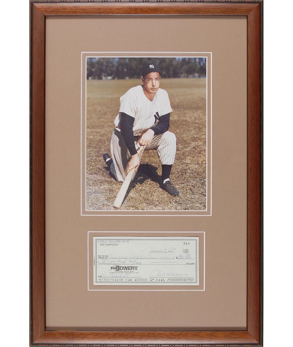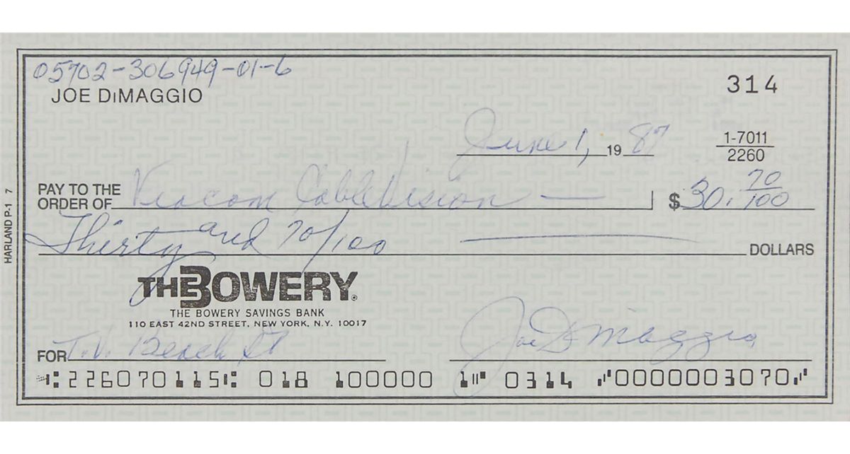 Personal check, 6 x 2.75, filled out and signed by DiMaggio, payable to Viacom Cablevision for $30.70, June 1, 1987. Nicely double-matted and framed with a color photo of DiMaggio to an overall size of 13.25 x 19.5. In fine condition.