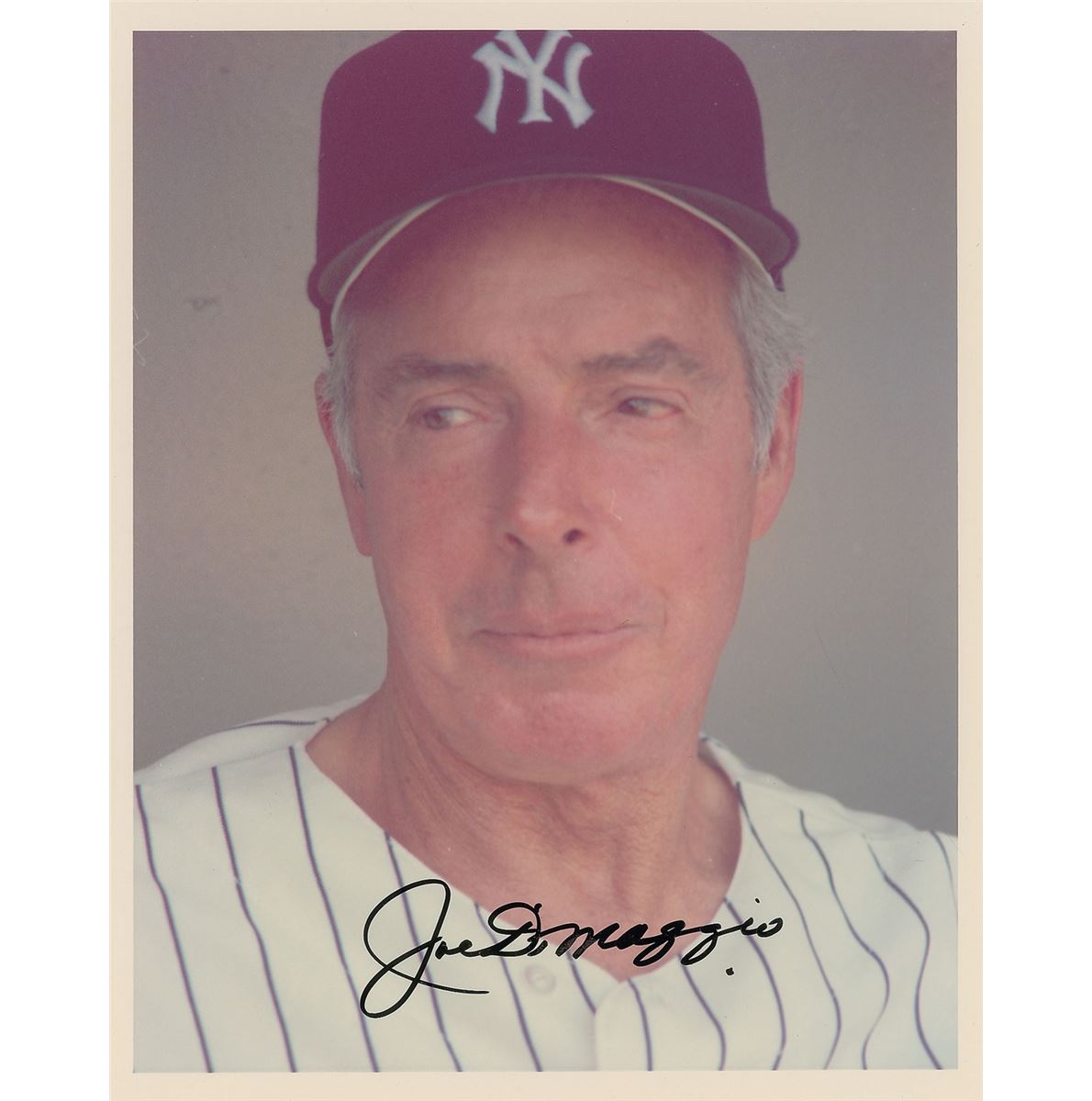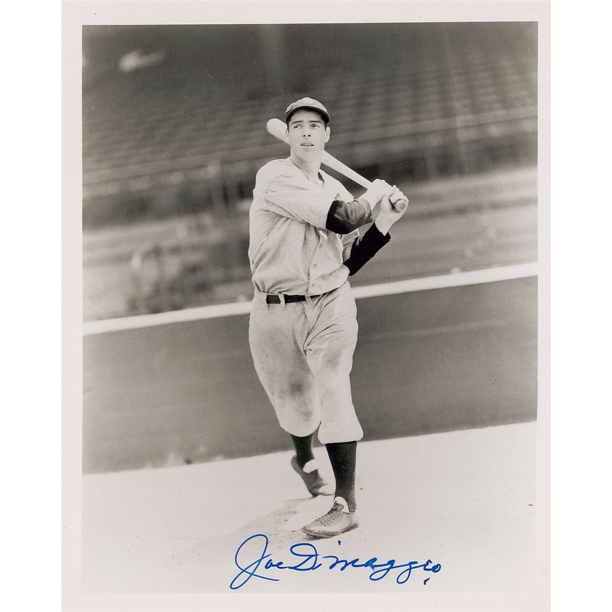 Two photos: a color glossy 8 x 10 photo of DiMaggio in later age, signed in black felt tip; and a glossy 8.25 x 10.25 full-length photo of DiMaggio post-swing, signed in blue felt tip. In overall fine condition.