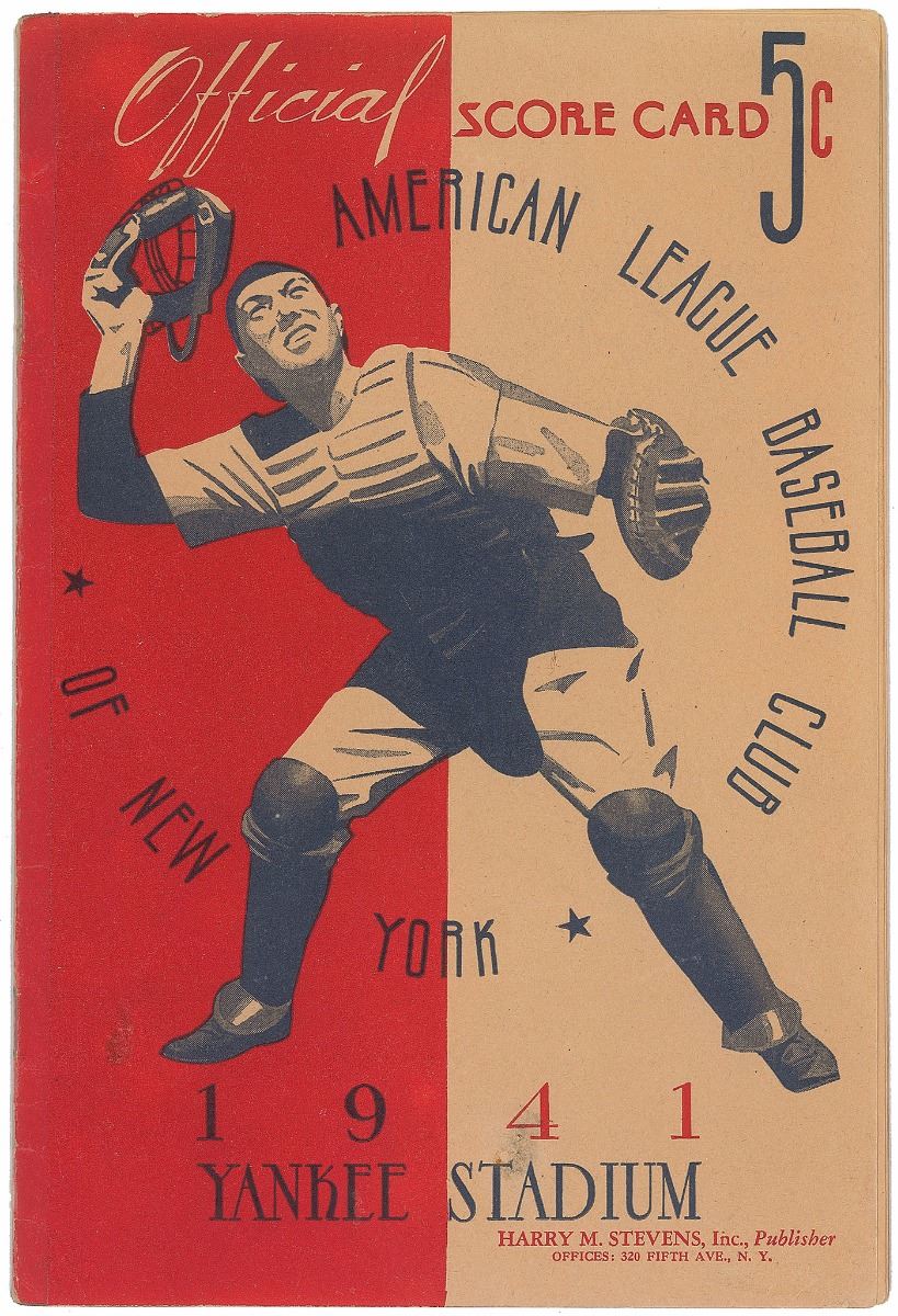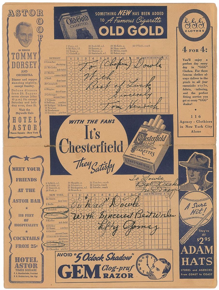 Program for a 1941 game between the New York Yankees and Detroit Tigers, 6.5 x 10, signed and inscribed inside on the scorecard in fountain pen, “To Dowle, Best Wishes, Joe DiMaggio,” “To ‘Dad’ Dowle, With Sincere Best Wishes, Lefty Gomez,” and “To (Chapin) Dowle, With Best of Luck, Sincerely, Tom Henrich.” A reinforced binding and some feathering to ink, otherwise fine condition. A desirable example of DiMaggio’s early signature.