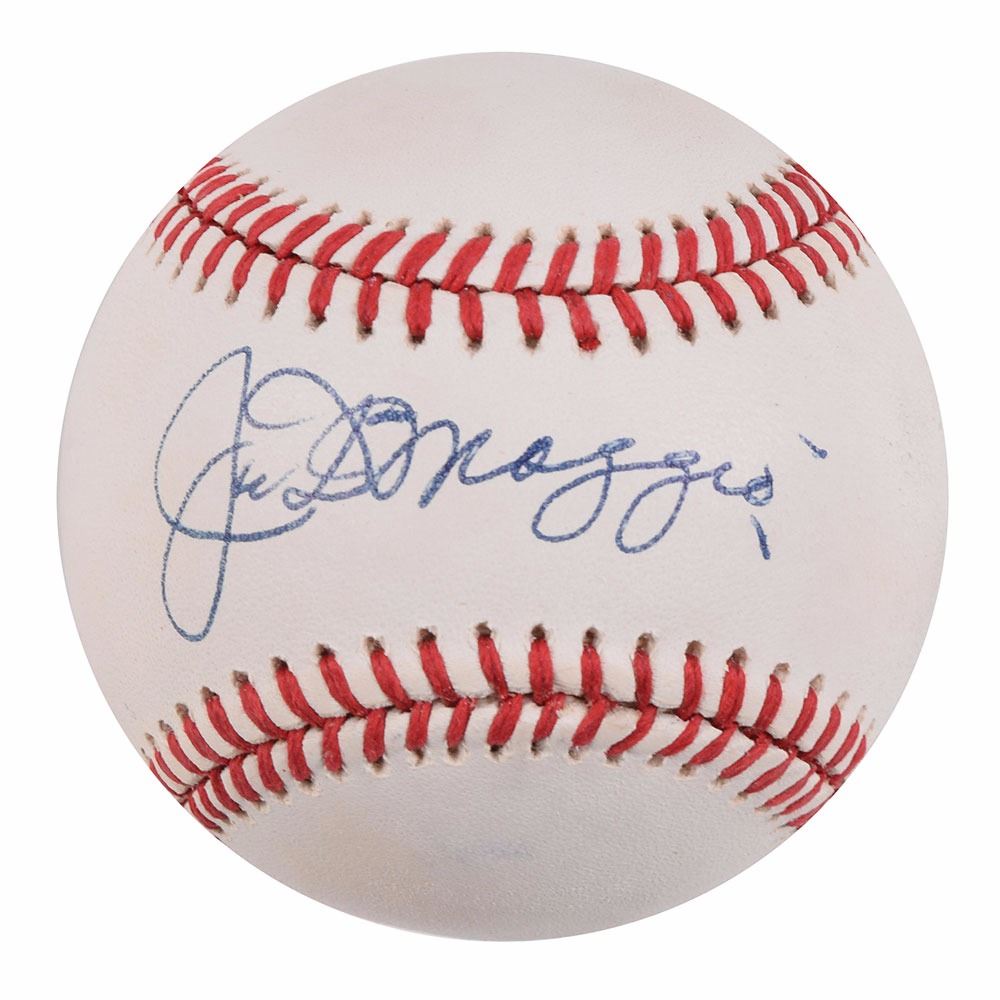 Official Rawlings American League (Brown) baseball signed in blue ballpoint on the sweet spot by Joe DiMaggio. In fine condition.