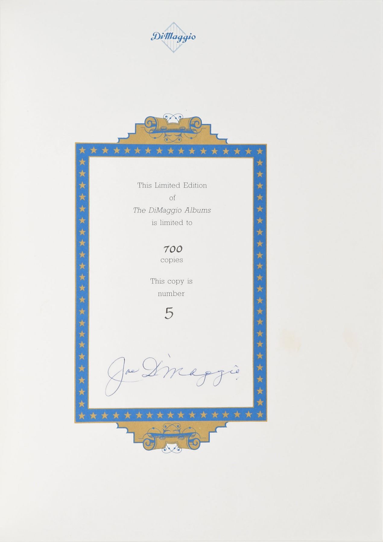 Signed book: The DiMaggio Albums, Volumes I and II. Limited first edition, numbered 5/700. NY: G. P. Putnam's Sons, 1989. Leather-bound hardcover volumes in cloth-covered slipcase, 9.5 x 11.75, 800 total pages. Signed on the colophon of the first volume in black ballpoint by DiMaggio. In fine condition