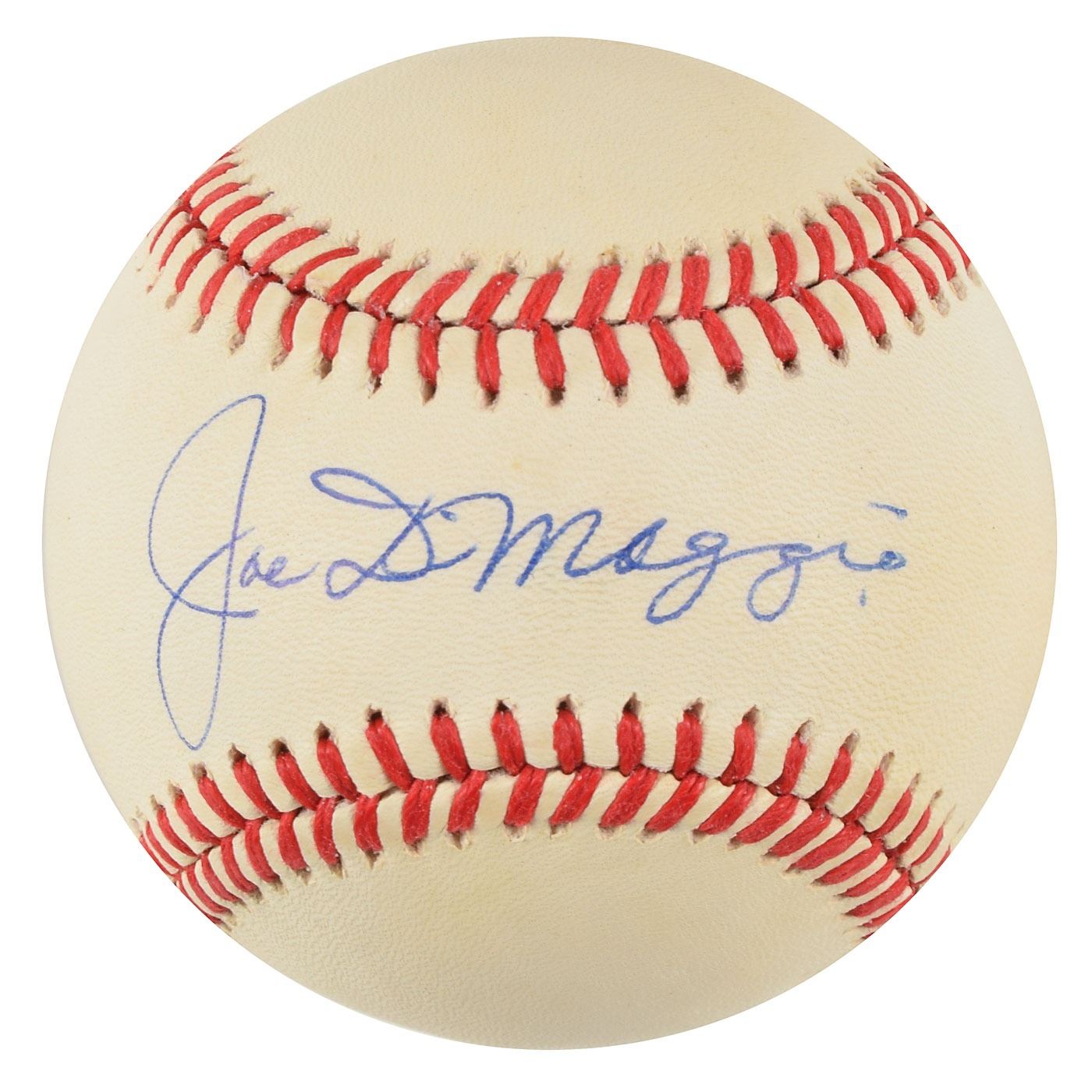 Official Rawlings American League (Brown) baseball boldly signed in blue ballpoint on the sweet spot by Joe DiMaggio. In fine condition, with minor soiling to side panels.