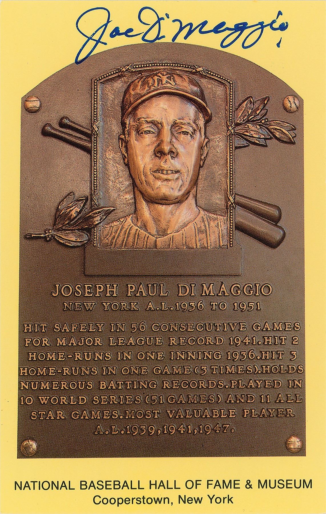 Gold Hall of Fame plaque card signed along the top in blue ink by DiMaggio. In fine condition.