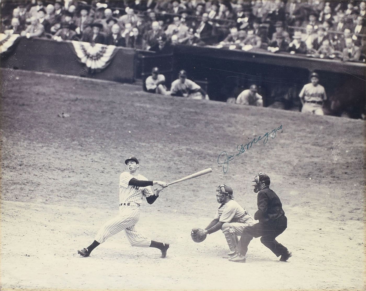 Desirable glossy 20 x 16 full-length photo of DiMaggio in a fantastic post-swing pose, signed in black felt tip. Reverse bears a notary public stamp and seal. In fine condition.