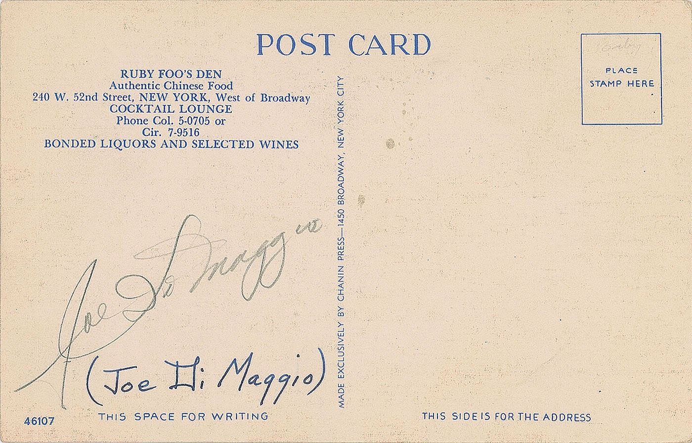 Vintage pencil signature, "Joe DiMaggio,” on the reverse of a color 5.5 x 3.5 postcard for New York Chinese restaurant and cocktail lounge Ruby Foo's Den. In fine condition. An early example of a 'Joltin' Joe' autograph.