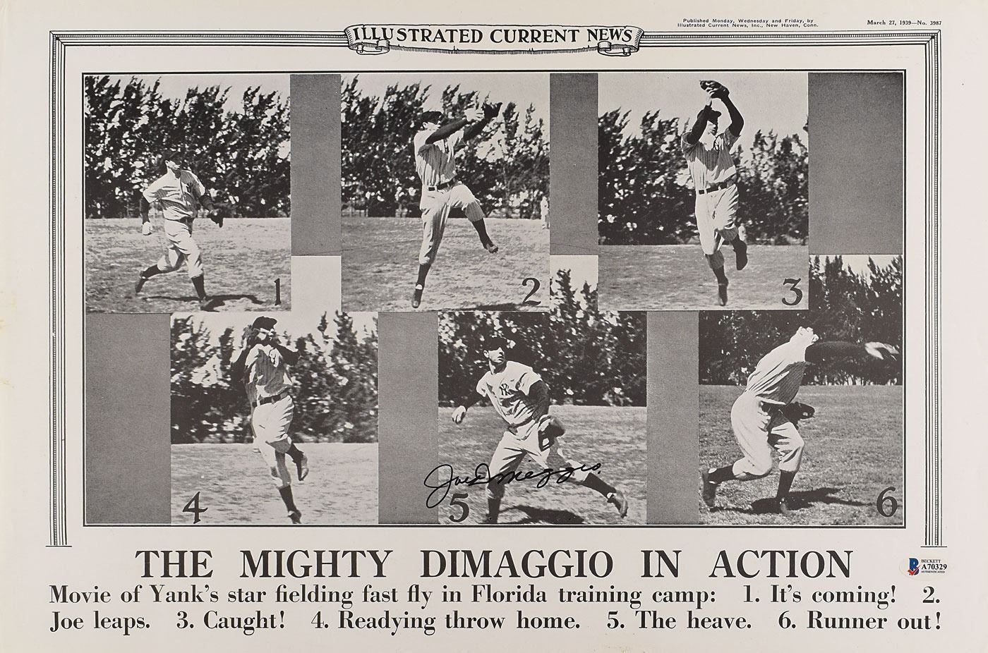 Large original Illustrated Current News poster, dated 1939, entitled 'The Mighty DiMaggio in Action,' 19 x 12.5, featuring six images of the Yankees' rookie sensation Joe DiMaggio in-action, making plays in the outfield, signed in black felt tip. Bright and clean, as-issued and never posted, with only light handling wear and a Beckett label affixed to lower right corner. Accompanied by a certificate of authenticity from Beckett Authentication Services.