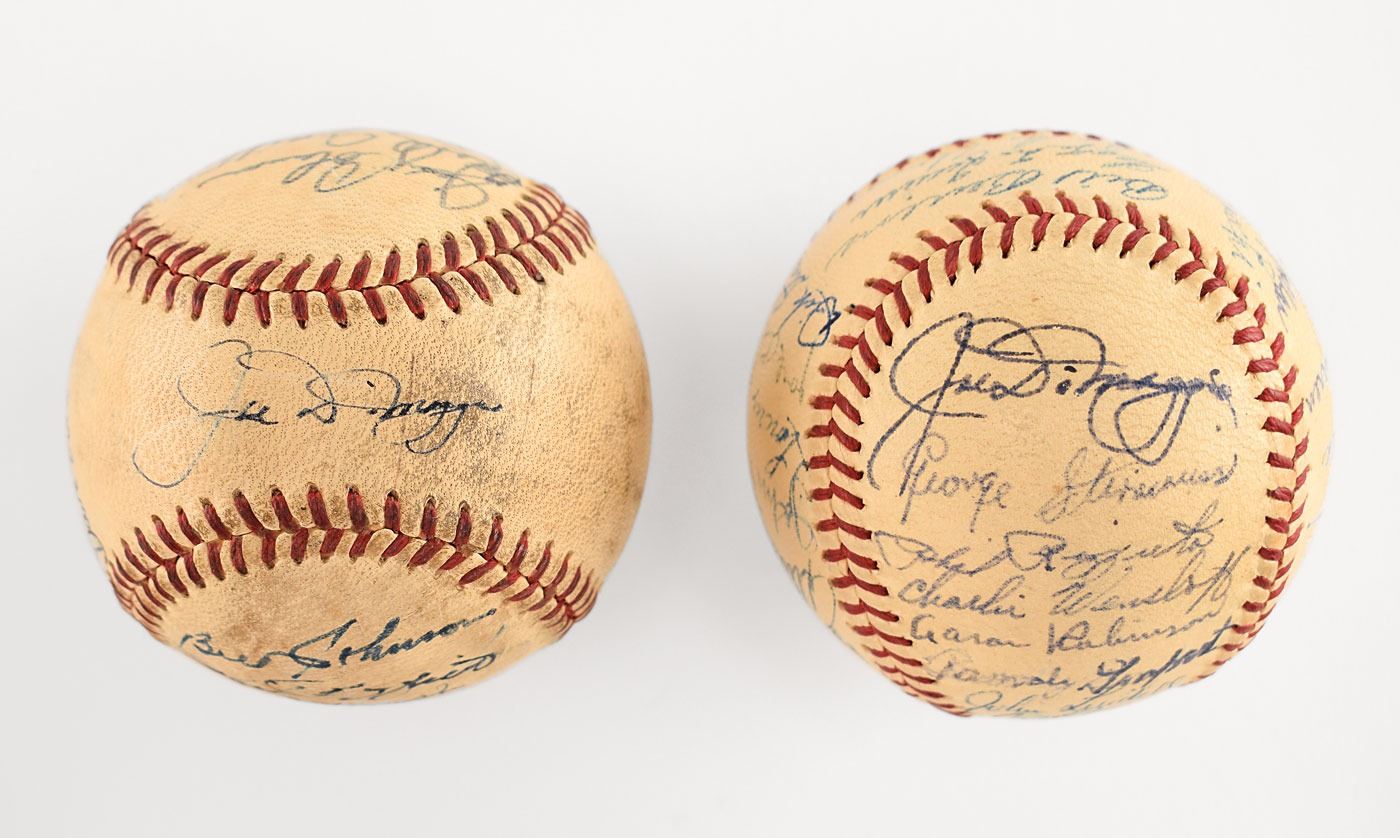 Two official Reach American League (Harridge) baseballs, each signed in fountain pen by Joe DiMaggio and a multitude of other Yankees (some of which may be clubhouse). In very good to fine condition, with light soiling and scuffing. Accompanied by a torn Reach baseball bag.