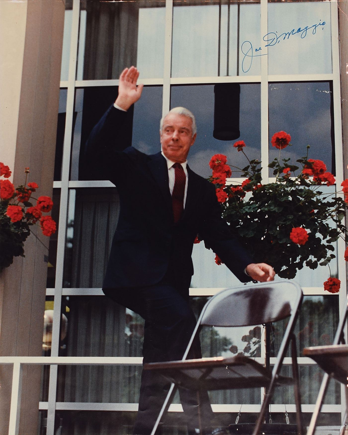 Color satin-finish 16 x 20 photo of an older DiMaggio waving to the crowd as he ascends a flower-covered stage, signed in blue felt tip. In very good condition, with overall creasing, light scuffing, and a tack hole to the top center.