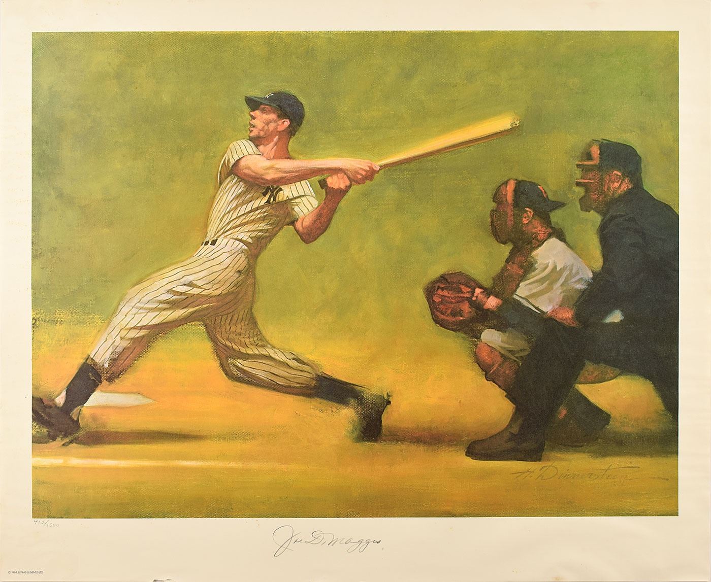 Color limited edition 22 x 18 lithograph of Yankees Hall of Famer Joe DiMaggio at bat from the Sports Illustrated 'Living Legends' series, numbered 412/1500, signed in the lower border in pencil by DiMaggio. In fine condition.