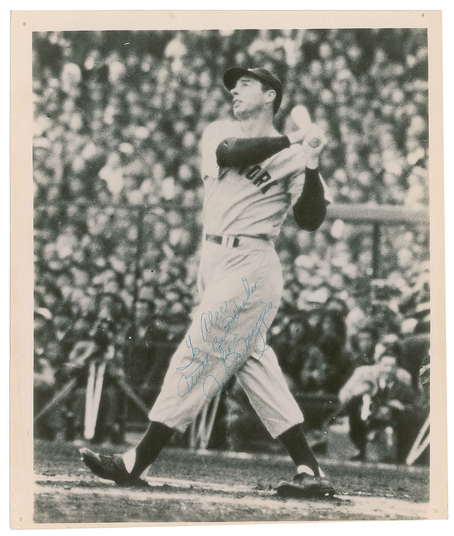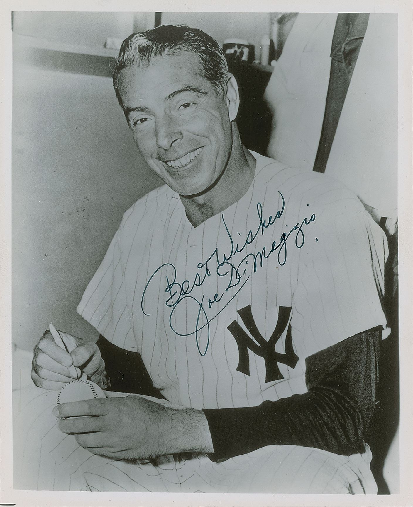 Two photos: a glossy 8 x 10 photo of Joe DiMaggio wearing his Yankees uniform and signing a baseball, signed in black felt tip, "Best wishes, Joe DiMaggio"; and a satin-finish 8.25 x 9.75 full-length photo of DiMaggio watching his hit sail into the outfield, signed and inscribed in blue ballpoint, "To Alec, with best wishes, from, Joe DiMaggio." In overall very good to fine condition, with some light creasing, and corner tack holes to the full-length pose.