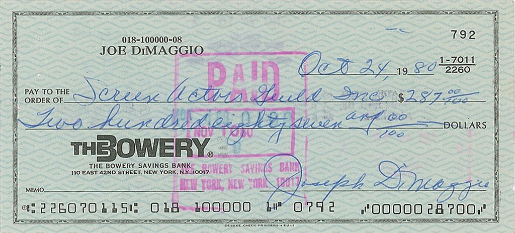 Personal check, 6 x 2.75, filled out and signed by DiMaggio, "Joseph DiMaggio," payable to Screen Actors Guild for $287, October 24, 1980. In fine condition.