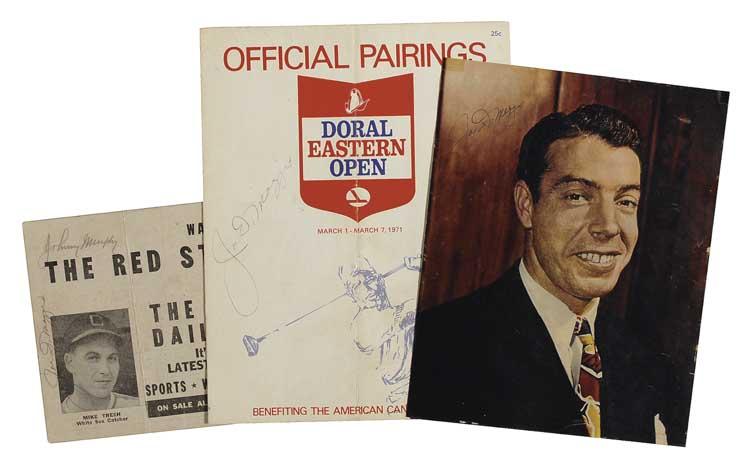 Three items: vintage color 8 x 10 magazine photo, signed in blue ballpoint; vintage 5.75 x 6.5 scorecard portion, signed in pencil by DiMaggio; and a 1971 pairings sheet from the Doral Eastern Open, signed on the front cover in pencil. In very good overall condition. Pre-certified Steve Grad/PSA/DNA and RRAuction COA.