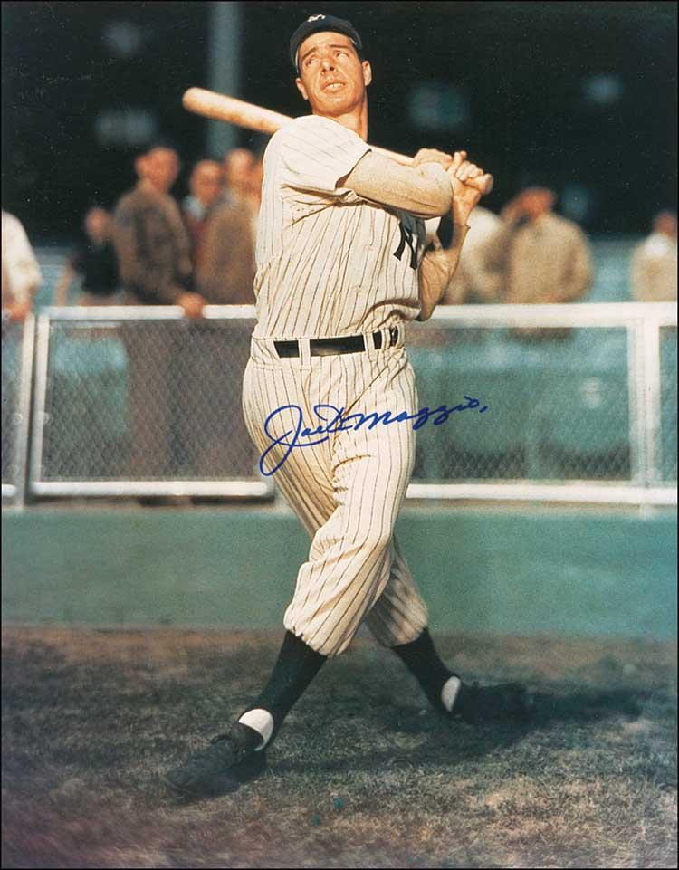 Color glossy 11 x 14 photo of DiMaggio clad in his Yankee pinstripes, signed in blue felt tip. In fine condition. Pre-certified Steve Grad/PSA/DNA and RRAuction COA.