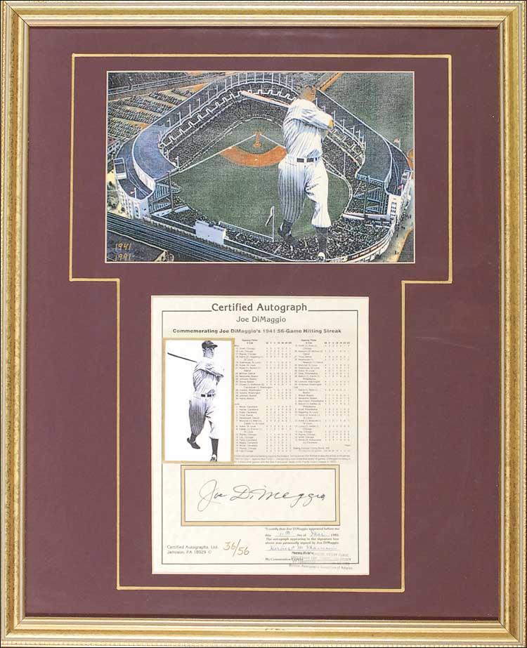 Very nice notarized and numbered 36/56 stat sheet, 8 x 10, detailing DiMaggio’s 1941 56-game hitting streak with a small baseball card-sized photo attached to the left side. Signed in black felt tip in a special signature area. Matted and framed with a color composite image to an overall size of 17 x 22. In very fine condition. Pre-certified Steve Grad/PSA/DNA and RRAuction COA.