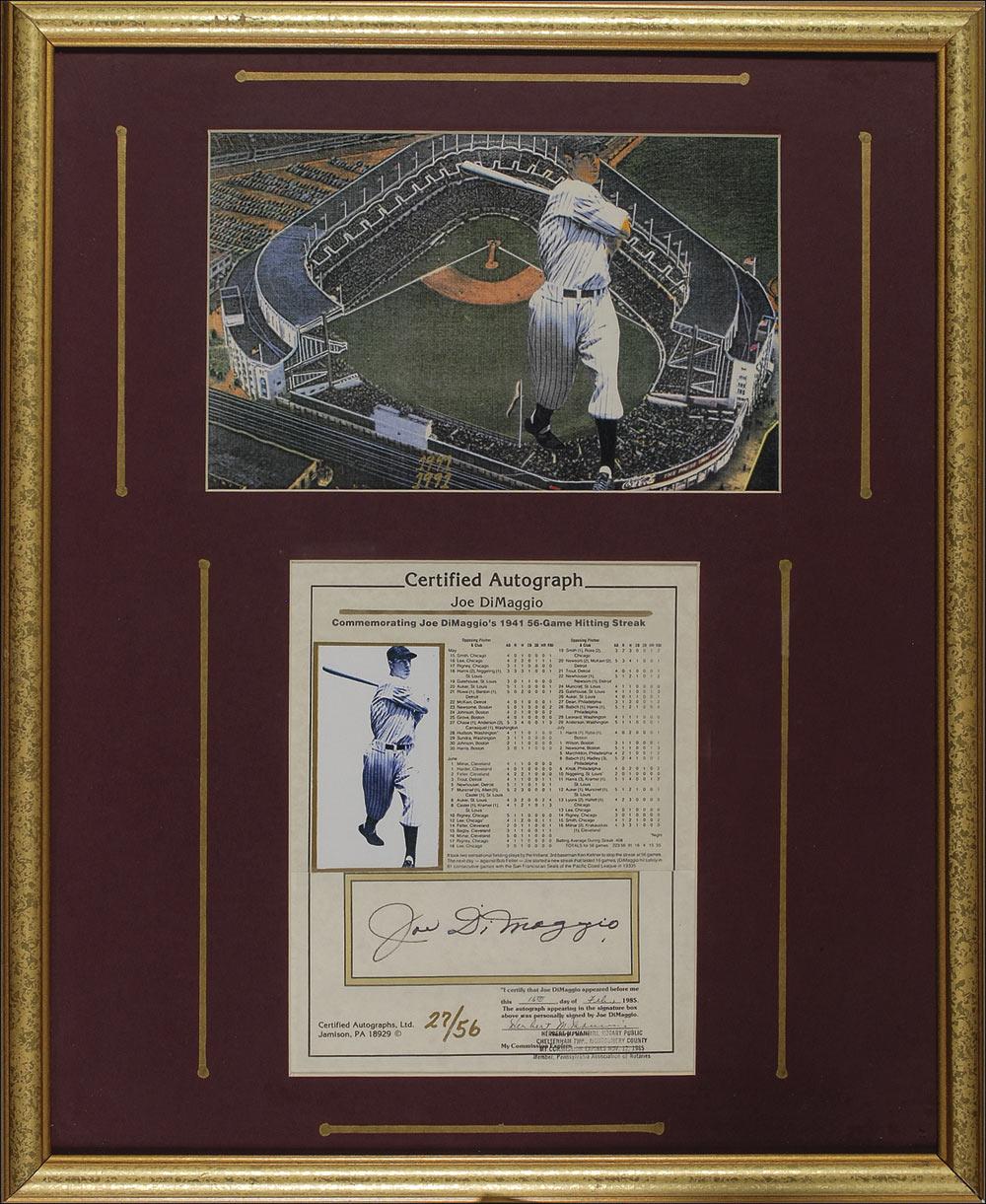 Very nice notarized and numbered 27/56 stat sheet, 8 x 10, detailing DiMaggio’s 1941 56-game hitting streak with a small baseball card-sized photo attached to the left side. Signed in black felt tip in a special signature area. Matted and framed with a color composite image to an overall size of 17 x 22. In very fine condition. Pre-certified Steve Grad/PSA/DNA and RRAuction COA.