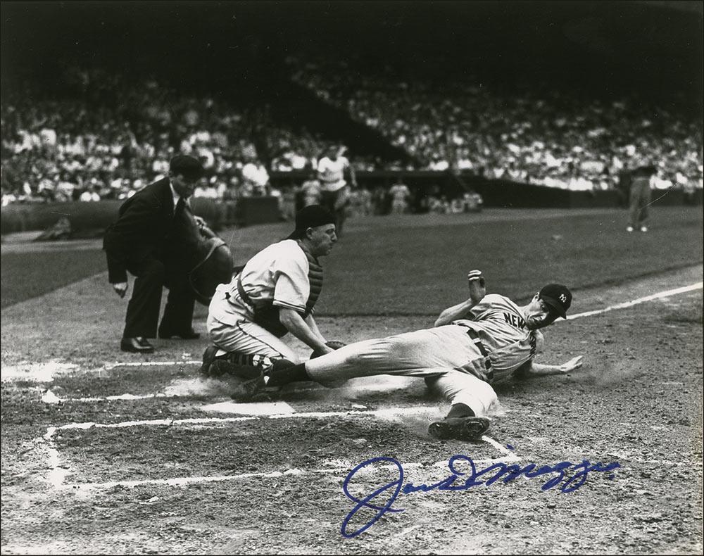 Glossy 10 x 8 photo of DiMaggio sliding into home plate before the tag, signed in blue felt tip. In very fine condition. Pre-certified Steve Grad/PSA/DNA and RRAuction COA.